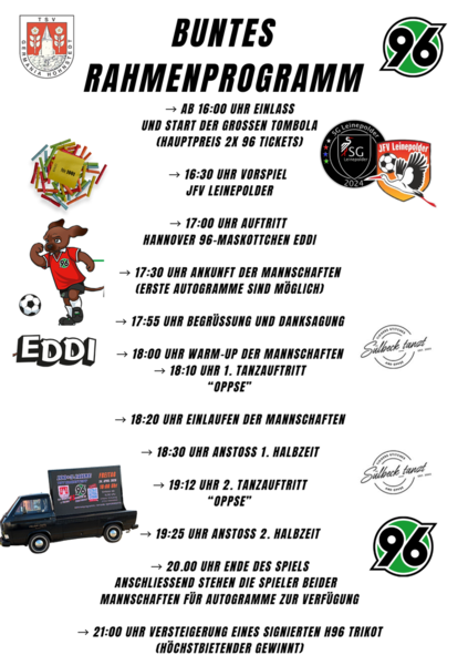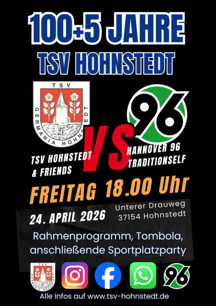 Neben dem Highlight, dem Freundschaftsspiel des TSV Hohnstedt & Friends gegen die Tradionself von Hannover 96 warten Tanzauftritte, eine Tombola und ein buntes Rahmenprogramm mit der ein oder anderen Überraschung. Am Abend findet dann die große Sportplatzparty statt.